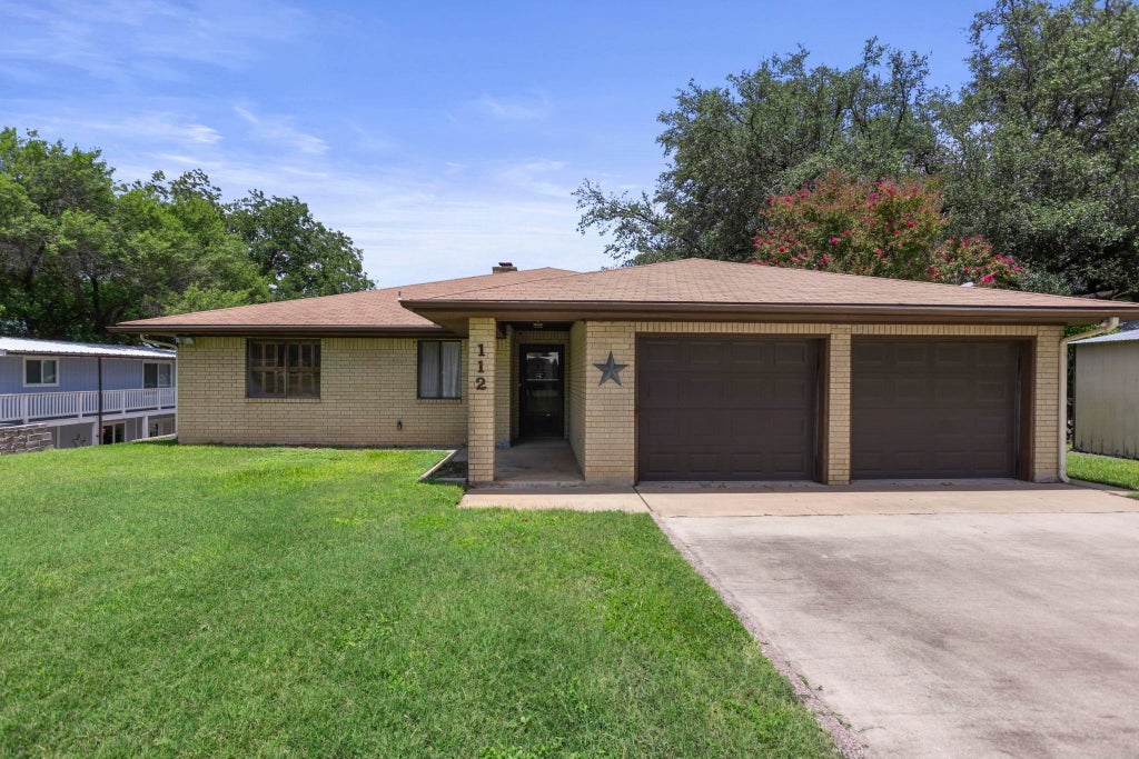 OPEN WATER ON LAKE LBJ This well-maintained, two-bedroom, two-bath, plus study, is a one-owner lakefront residence tucked away in the private Comanche Rancherias community. Built in 1985, the 1,952 sq. ft. one-story home showcases thoughtful craftsmanship and a spacious layout designed for relaxed lakeside living. Enjoy breathtaking open-water views from the many north-facing windows overlooking the lake. The welcoming living room features a classic brick fireplace, while the galley-style kitchen is equipped with granite countertops and ample cabinetry, flowing seamlessly into a generous dining area. Features an expansive screened-in back porch and day dock. The two-car garage is complemented by a long concrete driveway with room for multiple vehicles. Residents enjoy access to a community boat ramp, adding to the lifestyle appeal of this peaceful lakeside neighborhood. This home is just waiting for your personal touches and updates—an ideal retreat or full-time residence.