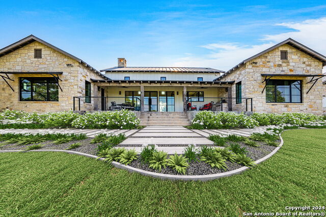 Located on 5 Ag-Exempt acres, this 3,325 sq. ft. German Farmhouse-inspired home embraces Hill Country architecture. With 3 bedrooms, each with an en-suite bath, plus a half bath, the split-bedroom layout flows into an open living, dining, and kitchen area. Large floor-to-ceiling windows, soaring ceilings with reclaimed Canadian barn beams, and polished concrete floors surround a stunning stone fireplace. The chef's kitchen features top-of-the-line Jennair appliances, quartzite countertops, a built-in 48-inch fridge, farmhouse sink, stylish hardware, and a spacious walk-in pantry. The primary suite offers a luxurious bath with a double vanity, separate shower, and tub, with beautiful tile cascading up the wall. His-and-her closets provide ample storage. Additional features include a large office with Hill Country views, a workout room, mudroom, and more. Foam insulation and fiber optics ensure efficiency. The east-facing back patio, with a built-in BBQ and 41-foot Canadian barn beam, overlooks the serene Hidden Springs Green with unobstructed views. Community amenities include a pool, pickleball, volleyball, and more, all near wineries and a short distance to airports.