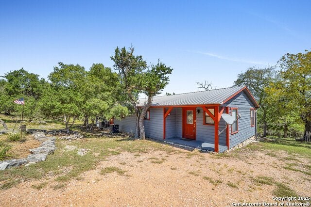 Quiet Country Getaway with Modern Amenities. Escape to this peaceful retreat nestled in nature. The property boasts stunning views of a valley with a wet-weather creek, where a large deck offers the perfect vantage point for birdwatching and wildlife observation. The open-concept great room, featuring floor-to-ceiling picture windows, brings nature indoors. Enjoy cozy evenings by the wood-burning stove, with built-in bookshelves adding a touch of charm. The recently updated kitchen offers modern conveniences, including granite countertops, a center island with a pull-up bar, and a custom cedar natural edge bar, perfect for entertaining or casual dining. This home features two bedrooms plus a flexible library/office space. The master suite includes a spacious closet with Elfa shelving for optimal organization. For added flexibility, the 200 sq ft cabin is equipped with a full bath, kitchenette, and a 300 sq ft screened porch-ideal for guests or as a private retreat. Additional amenities include: Large workshop/barn; Metal two-car carport Newly installed metal roof and AC unit Expansive stone patio; A natural sanctuary for wild cherries, bats, and wildlife. Close to wineries!