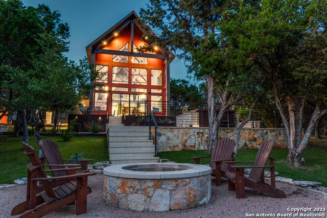 Big Texan Sky has everything you could want in a Hill Country home. Step inside to a stunning view- the floor to ceiling windows overlook 8.5, AG exempt acres. The main home consists of 2 bedrooms and 2.5 baths. The architect and sellers put careful thought into the design aesthetics when creating this 'Hill Country Modern' home. All furniture remains making this a convenient turnkey property. The style extends to the native landscaping and outdoor entertaining areas with a stone encased spa, perfect for relaxing to enjoy the sunset. Just below that sits a fire pit for hosting larger parties. The sellers have cleared a nature path for ease of exploration on the property. To call this 26' X 40' simply a garage, would be an understatement. Not only is there space for 3 cars, epoxy shield flooring, and an insulated and automatic glass garage door, but it also includes 22' X 14' living quarters appointed with a full bath with a spa like walk-in shower. This space includes a king size bed and full size couch. Your guest will not want to leave. Big Texan Sky has been operating as a vacation rental for several years with incredible reviews. This could continue as an income-producing property with potential to grow or work for anyone looking for a truly unique home surrounded by breathtaking views and peaceful quiet.