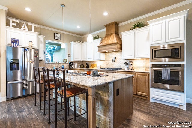 Welcome to this immaculate custom-built ranch home nestled on a spacious corner lot in the highly sought-after Rockin J Ranch community. Located on a quiet cul-de-sac with only two other homes, this property offers privacy, abundant green space, and proximity to the neighborhood park and driving range. This home boasts excellent curb appeal and thoughtful upgrades throughout, including rock-lined garden and shrub beds, an extended covered patio-perfect for outdoor entertaining-and upgraded stainless steel appliances in a kitchen featuring granite countertops and a stylish backsplash. The open-concept floor plan includes a spacious living area, two-sink guest bathroom, and a primary suite with a large walk-in shower and upgraded showerhead. Every detail has been carefully considered to offer comfort, style, and functionality. Don't miss the opportunity to live in a peaceful, amenity-rich community with easy access to golf, parks, and Hill Country charm! Walking distance to the junior Olympic pool, fishing pier, and pro shop Access to parks and hiking trails. "Valler Creek Golf Club" allows property owners 3 rounds of golf per month. Don't miss your opportunity to own a piece of the Texas Hill Country in this amenity-rich golf course community! Schedule your private tour today!