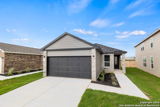 Step into style and comfort with this thoughtfully designed home featuring soaring 9-ft. first-floor ceilings. The kitchen shines with Whirlpool stainless steel appliances, Woodmont Dakota Shaker 42-in. cabinets, Silestone Helix countertops, and an extended breakfast bar. Relax in the primary bath offering upgraded cabinets, an extended vanity with knee space, and a 42-in. garden tub/shower with Daltile tile surround. Decorative touches include a striking Texas Star entry door, Kwikset Polo knobs, and vinyl plank flooring in key areas. Enjoy a soft water loop, covered patio, sprinkler system, and a fully sodded yard.