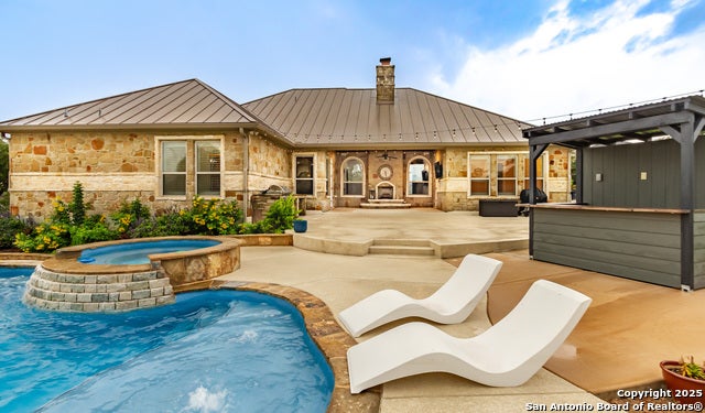 Welcome to your dream home nestled in the heart of the Texas Hill Country, in the highly sought-after community of Vintage Oaks in New Braunfels. This stunning single-story residence offers the perfect blend of luxury, comfort, and privacy on a beautifully landscaped 1.09-acre cul-de-sac lot backing to a peaceful Nature Preserve easement. Featuring three spacious bedrooms, two and a half baths, and a dedicated study, this home is thoughtfully designed with a versatile two-living area layout, perfect for both everyday living and entertaining. The gourmet kitchen is a chef's dream with gas cooking, custom cabinetry, stone countertops, and premium appliances. Enjoy the beauty of the Texas outdoors from your own private oasis. Step outside to a resort-style pool with attached hot tub, outdoor kitchen, and a cozy outdoor fireplace-ideal for year-round gatherings. The fully fenced backyard offers privacy and tranquility, while the circular driveway adds curb appeal and convenience. Crafted with care, this home features four-sided stone construction and a durable metal roof, combining timeless Hill Country charm with lasting quality. Located in the vibrant Vintage Oaks community-known for its top-tier amenities, scenic surroundings, and active lifestyle-you'll be just minutes from award-winning wineries, boutique shopping, and local dining. Conveniently situated between Austin and San Antonio, with easy access to both airports, this home offers the perfect balance of rural peace and urban accessibility. Amenieties include:Olympic-Sized Pool, Lazy River, Fitness Club and Pool, Kids Pool, Bear Creek Neighborhood Pool, Volleyball Court, Baseball/Softball Field, Tennis & Pickleball Courst, 2 playgrounds, Expansive Tuscan Clubhouse, Grilling Pavilion and Event Venue, Timber Ridge Veterans Park. Don't miss your opportunity to own a slice of paradise in one of New Braunfels' most desirable neighborhoods.