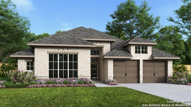 Entry welcomes with 12-foot ceiling. Game room with French doors and 12-foot ceiling off coffered extended entry. Spacious family room with a wood mantel fireplace and wall of windows opens to kitchen and dining area. Kitchen features generous island with built-in seating space, two wall ovens, and a 5-burner gas cooktop. Private primary suite includes bedroom with 12-foot ceiling. Dual vanities, freestanding tub, separate glass-enclosed shower and two large walk-in closets in primary bath. Abundant closet space and natural light throughout. Extended covered backyard patio. Mud room off two-car garage with additional garage bay space.