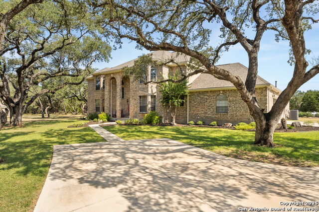 Come by the DUAL OPEN HOUSE: 25955 Post View + 25960 Bent Bluff (backs up to this property) Sat. 8/23 from 10 AM - 1 PM! At the very end of a quiet cul-de-sac in the coveted gated community of Lewis Ranch, you'll find a property that feels like a private retreat. Set on 3.61 acres and surrounded by mature oaks, this 3,748 sq. ft. home combines timeless architecture with a park-like setting that few properties can match. The exterior makes a lasting first impression with its four sides of brick masonry and a dramatic two-story covered front porch. Inside, the living area immediately captures attention with soaring two-story ceilings, abundant natural light, and a striking fireplace as its centerpiece. To the right, a formal dining room connects seamlessly to the kitchen, while to the left, the primary suite offers privacy and direct access to the backyard oasis. The downstairs living area has been upgraded with hardwood floors, and the open-concept kitchen flows beautifully into the main living space, perfect for both daily living and entertaining. Step outside, and the lifestyle you've been searching for comes alive. Double doors from the living area lead to a fenced-in pool, hot tub, and covered back porch that make relaxation effortless. A game room and bar open directly to this space as well, making it ideal for hosting gatherings. The primary suite also enjoys private access to the pool and features a spacious bath and walk-in closets. Upstairs, three additional bedrooms provide plenty of room for family or guests, each designed with comfort in mind. The backyard is expansive and serene-perfect for watching local wildlife or enjoying the Hill Country sunsets. A workshop, previously used for woodworking, adds versatility and functionality to the property. Lewis Ranch is known for its peace, privacy, and generous lot sizes, all while offering convenient access to both New Braunfels and San Antonio. This is more than just a home-it's a retreat, a gathering place, and a lifestyle that can't be replicated. Schedule your showing today before this rare cul-de-sac estate in Lewis Ranch is gone.