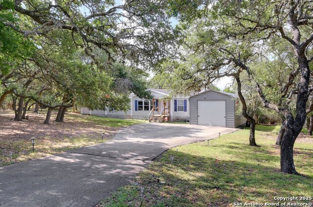 Welcome to this serene 1,920 sq ft, 3-bedroom, 2-bath home on a peaceful half-acre lot, built in 1999 & surrounded by majestic oak trees. Recently updated with fresh interior & exterior paint, this very well maintained home offers both charm & move-in-ready comfort. Enjoy regular visits from whitetail & axis deer, along with birds & foxes-nature lovers will feel right at home. The spacious kitchen is a true highlight, featuring a large island & abundant cabinet space, ideal for cooking, hosting & gathering. Relax on the covered front porch or spacious back deck & pick fresh fruit from your very own peach tree (seasonal). The home also includes a separate primary suite w/a walk-in closet, dual sinks & a private bathroom, plus a versatile flex room perfect for a workout space or home office. A metal drive-thru garage & low electric bills add to the home's appeal. All this in a fantastic location near recreational areas; Canyon Lake, Blanco River, wineries plus easy commute to Fredericksburg, Austin, San Antonio, Canyon Lake & San Marcos.