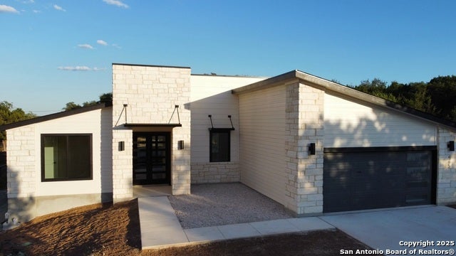 Brand-new contemporary home nestled deep on a spacious 0.5-acre lot in the highly desirable Canyon Lake Island community! This thoughtfully designed open-concept floorplan offers 3 bedrooms, a dedicated study, and 2 full bathrooms-perfect for both everyday living and entertaining. The layout was crafted with functionality in mind, featuring a walk-through utility room that connects to an oversized walk-in closet for ultimate convenience. You'll love the airy, spacious common areas, highlighted by tall ceilings, large windows, and custom-built cabinetry. Natural light floods the home, creating a warm and inviting atmosphere. The oversized garage is fully finished with a sleek epoxy floor-truly move-in ready! Quality construction features include energy-efficient windows, a custom walk-in shower, and distinctive metal accents that set this home apart from traditional production builds. Step outside to a large covered back patio with a beautiful stained tongue-and-groove ceiling-ideal for hosting gatherings or simply relaxing in your private outdoor space. The generous backyard offers endless opportunities for personalization. Enjoy the perks of a close-knit neighborhood with highly rated schools in this sought-after area. Construction is nearing completion-be one of the first to tour this incredible new home without the wait of a long contract period!
