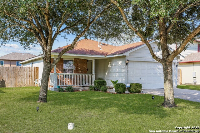 Welcome to a charming 3-bedroom, 2-bathroom home that combines comfort, convenience, and community. From the moment you arrive, you'll notice the inviting curb appeal with a shaded front yard and covered porch, perfect for enjoying quiet mornings or evening sunsets. Step inside to a bright entryway that opens into the spacious living area. The open floor plan connects the living room, dining area, and kitchen, creating a natural flow for entertaining and everyday living. The living room features large windows that bring in plenty of natural light, while the kitchen offers classic wood cabinetry, white appliances, a gas range, and a roomy dining space with direct access to the backyard-making indoor-outdoor living simple. The primary suite is a comfortable retreat with a private en-suite bath and walk-in closet. Two additional bedrooms and a full bath provide flexibility for family, guests, or a home office. Enjoy the expansive backyard with room to garden, play, or host weekend cookouts-fully fenced for privacy and ready for your personal touch. This home is located in a welcoming community just minutes from local schools, shopping, and dining. With quick access to I-35, commuting is a breeze-only a short drive to Austin and within easy reach of San Antonio. Don't miss this opportunity to own a move-in ready home in one of Kyle's most desirable neighborhoods.