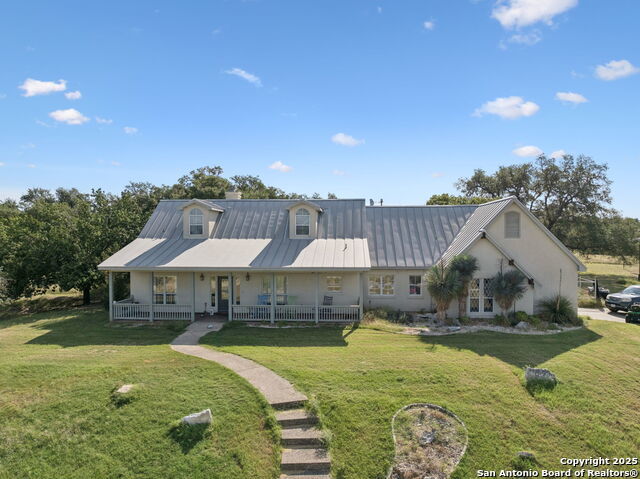 Nestled on 39 acres of gently rolling Hill Country terrain, this exceptional 4-bedroom, 2-bathroom home offers both comfort and functionality. The thoughtfully designed split floor plan includes a dedicated office, formal dining room, and a spacious living area with soaring ceilings and a cozy fireplace. The heart of the home is a chef's dream kitchen featuring stunning quartzite countertops, a large island, and two oversized pantries for ample storage. A mudroom off the two-car garage adds convenience. Ret