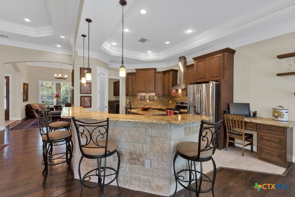 Welcome to this impeccably maintained single-story home nestled in the community of The Woodlands. This charming residence offers a perfect blend of elegance, comfort, and functionality, all situated on a peaceful dead-end street that backs up to lush greenery and a golf course. Step inside to find tall ceilings and an open floorplan that create a sense of spaciousness throughout. Beautiful wood floors run seamlessly across the home, enhanced by refined crown molding and plantation shutters that add timeless character. The flexible formal living or dining area offers options for entertaining or relaxing in style. The heart of the home is the chef-inspired kitchen, featuring rich alder cabinets, granite countertops, and a large island adorned with a decorative stone facade. Adjacent to the kitchen, enjoy the 400+ sq ft sunroom, fully conditioned with a mini split system. Surrounded by large windows, this serene space is bathed in natural light and offers breathtaking views of the nature just beyond your backyard. The spacious primary suite is a private retreat, complete with backyard access, a luxurious bathroom featuring a separate tub and shower, and a generous walk-in closet. The beautifully landscaped backyard is fully enclosed with a wrought iron fence, providing security without compromising the view. Additional features include a solar attic fan for energy efficiency and exquisite detailing throughout. Whether you're enjoying quiet evenings on the back patio, entertaining in the sunroom, or cooking in your stunning kitchen, this home offers a rare combination of comfort, sophistication, and natural beauty. Don't miss the opportunity to make this peaceful retreat your forever home.