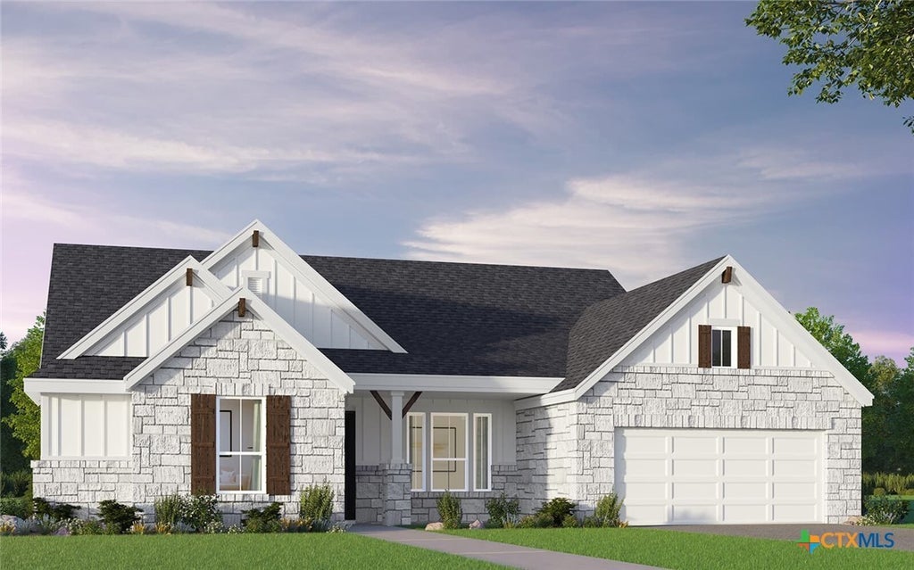 Estes plan with upgraded kitchen, quartz countertops, upgraded tile flooring, optional tray ceiling in living, optional 2 car side entry garage, Express cordless blinds