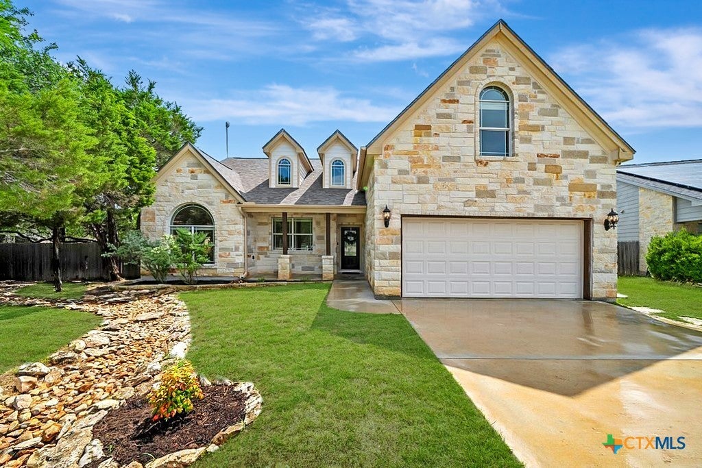 Tucked away on a quiet cul-de-sac in Woodcreek, this Hill Country charmer blends everyday comfort with natural elegance. 6 Stepping Stone Court welcomes you with native stone masonry, a charming front porch, and beautifully refreshed landscaping that sets the tone from the curb. Inside, the open-concept layout features high ceilings, recessed lighting, and thoughtful details like tray ceilings, arched entryways, and a striking floor-to-ceiling limestone fireplace. The kitchen offers granite counters, a breakfast bar, and rich espresso cabinetry that adds warmth and contrast. A cozy breakfast nook overlooks the backyard, creating a perfect spot for casual dining. The spacious primary suite features vaulted ceilings, a soaking tub, double vanity, walk-in shower, and his-and-hers closets. A front flex room with wood floors and ample natural light works beautifully as a home office or guest space. Just above the garage, a finished bonus room adds flexibility for a media space, gym, or creative retreat. Out back, enjoy a peaceful stone patio shaded by mature trees and complete with a built-in playscape—ideal for morning coffee or evening get-togethers. Just minutes from the golf course and downtown Wimberley, this home offers the best of Hill Country living with everyday convenience.