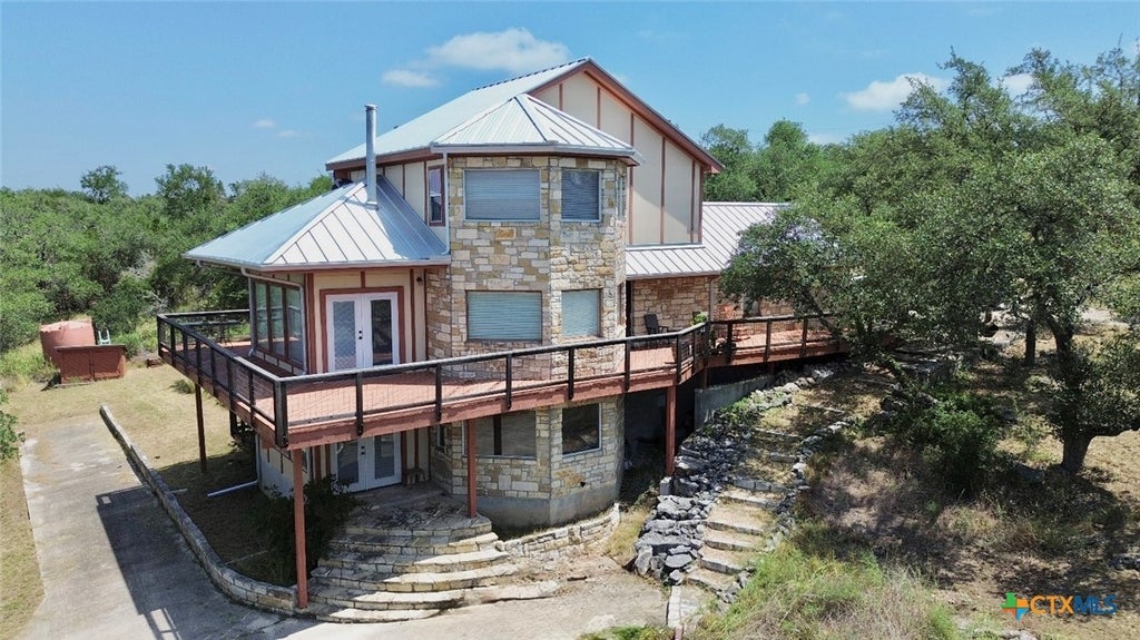 VIEWS for days! This stunning 3-story home on 6 private acres in the Falconwood subdivision is truly one-of-a-kind, surrounded by wraparound decks on every level to soak in the Hill Country scenery. Inside, you'll find expansive windows, multiple living areas, and standout features like an elevator, wood-burning stove, and three separate A/C units for ultimate comfort. The open floor plan offers flexibility-with potential for 3 bedrooms or private guest accommodations-plus a spacious garden area, spa, and two oversized concrete driveways. Recent upgrades include a new metal roof and new windows installed in 2024. The primary suite features a charming clawfoot tub, adding vintage elegance to your private retreat. The bottom floor includes a convenient kitchenette, perfect for guests or multi-generational living. With both attached and detached garages, granite counters, double vanities, and even the possibility to add a second guest home, this peaceful Hill Country escape is a rare and joyful find in San Marcos!