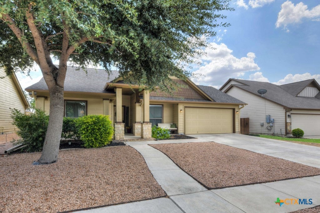 Experience the charm of this exceptional home nestled in the highly desirable Rivermill Crossing community. Meticulously maintained, this hidden gem is located within the New Braunfels loop, offering both comfort and convenience. Enjoy easy access to I-35 all while being tucked away in a serene neighborhood with sidewalks-perfect for leisurely walks with the pups or evening strolls. This inviting residence features three bedrooms, two full baths, and a versatile room with glass doors-currently used as a home office and gym. The center island kitchen boasts granite countertops, tiled backsplash, a dedicated coffee and wine bar, and a counter-height breakfast bar. Durable, easy-care solid surface flooring throughout the home, eliminating the fuss of carpet. The private primary suite offers a tranquil retreat after a busy day, with a charming bay window seating area overlooking the backyard, bath featuring dual vanities, a soaking tub, a separate shower, and an oversized walk-in closet. The secondary split bedrooms share a full bath, and all bedrooms plus the office feature elegant wood-look luxury vinyl plank flooring. Step outside to enjoy the beautifully xeriscaped front yard from your covered porch, and the partially flagstoned side and backyard-easy to maintain with low water usage, and perfect for outdoor gatherings. A large covered patio invites you to relax and entertain, while the fully permitted Tuff Shed offers a tidy and flexible space for a workshop, garden shed, or extra storage. Additional features include a water softener, sprinkler system, recent interior and exterior paint, a recently installed fence, and a brand-new roof (July 2025) with a transferable warranty-peace of mind for years to come. Ideally located just minutes from downtown New Braunfels and historic Gruene, with quick access to the Guadalupe and Comal Rivers. Seek out plenty of options with shopping, dining, wineries, music venues, and outdoor recreation!!