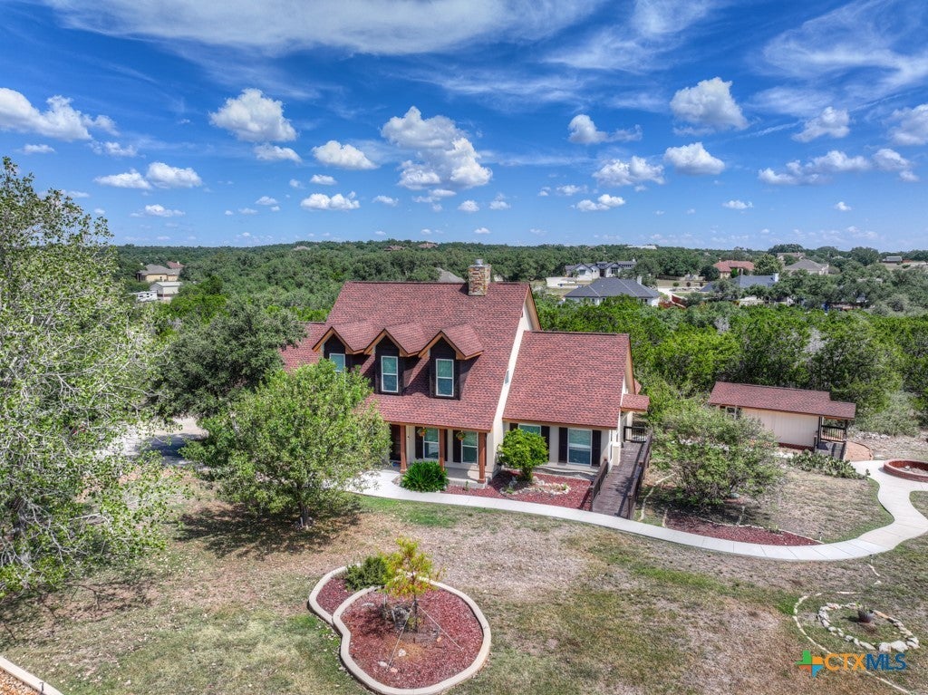 Nestled in the heart of the Texas Hill Country, a welcoming covered front porch leads you into this lovely 4-bedroom, 2.5-bath home that combines timeless craftsmanship with modern convenience. Designed with both comfort and accessibility in mind, the home features a spacious primary suite on the main floor, complete with a double vanity, whirlpool tub, and spacious walk-in shower with dual showerheads. An exterior door from the suite opens to a private ramp, offering easy outdoor access without compromising the home's elegant design. Inside custom cabinetry, built-ins, and exquisite trim work throughout give this home character. Custom cabinets, a large granite kitchen island and double ovens are ready for entertaining. The open living area has soaring ceilings, hardwood floors, and a see-through fireplace that creates a cozy yet refined atmosphere. The main level also includes a formal dining or living room and a study with French doors when you enter the home. A curved staircase leads to three additional bedrooms with brand new carpet, a large bathroom w/double vanity, and a versatile extra room above the garage. An oversized two-car garage w/built-in cabinets and work benches plus an air conditioned workshop has all the storage you need. Additional highlights include 2x6 exterior walls, radiant barrier roofing, 80-gallon water heater, and TREX composite decking on the back patio. There are two fruit trees plus a shady backyard offers both privacy & potential, ready to be transformed into your ideal outdoor retreat. River Chase amenities: 2 parks, a 58-acre park on Guadalupe River w/pavilion, hiking trails, camping grounds, and sports courts, plus a 32-acre clubhouse park w/pools, fitness center, walking trails, tennis courts, disc golf, fishing pond, & Veteran's garden. Minutes to Gruene, restaurants, shopping, music venues, theatres, and health care, and convenient to both Austin & San Antonio.