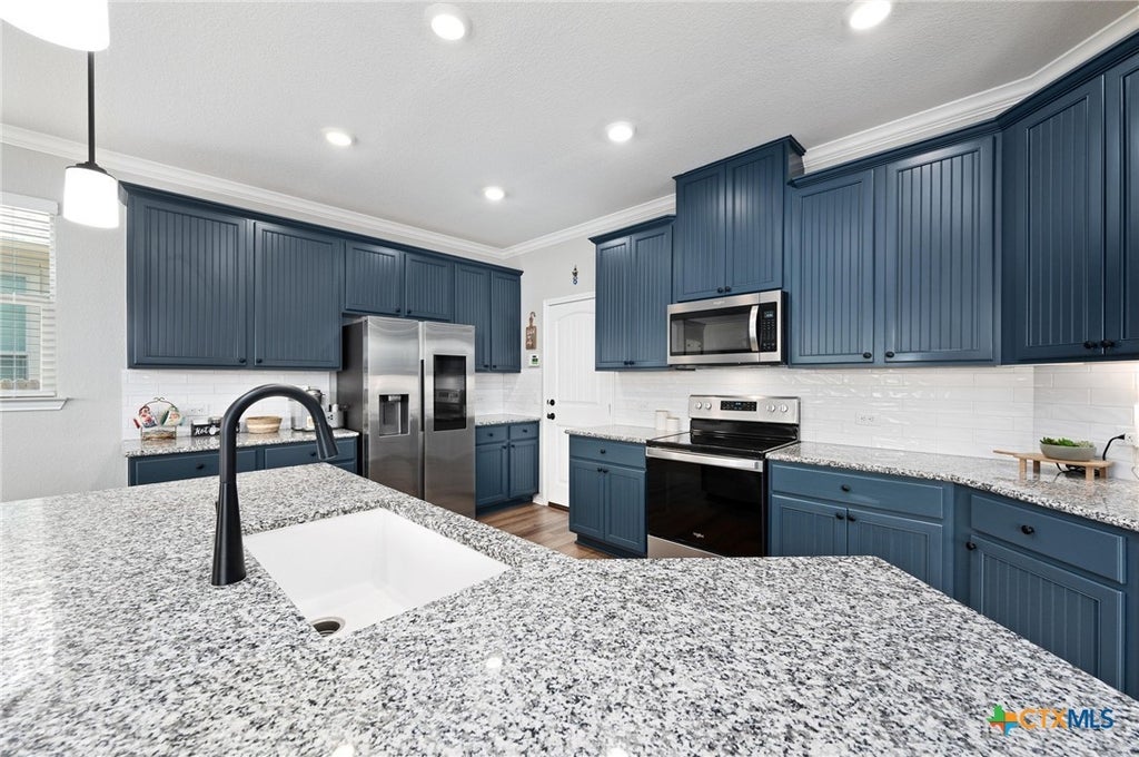 Welcome to Stagecoach Crossing in Kyle, where this 2022-built home stands out as the only four-bedroom, three full-bath option at this price point in the neighborhood. Designed with intention, the floorplan offers a main-level bedroom with a full bath, ideal for guests or multi-generational living, while the upstairs provides the primary suite, two additional bedrooms, two full bathrooms, and a spacious gameroom for comfortable separation between entertainment and private quarters. Luxury vinyl plank flooring runs throughout the downstairs, paired with tile in the wet areas, and brand-new carpet was installed in August 2025 for a fresh start. The kitchen is a true highlight with ample cabinet space, stunning designer-hued cabinetry, pantry, and generous counters perfect for cooking and entertaining. Outside, the welcoming front porch is ready for seasonal decor, plus exterior holiday lighting outlet upgrades, while the Texas-sized covered back patio and large backyard provide plenty of space to relax, entertain, or even add a pool. For additional storage and hobbies, the double-insulated, finished garage is a DIYers dream!